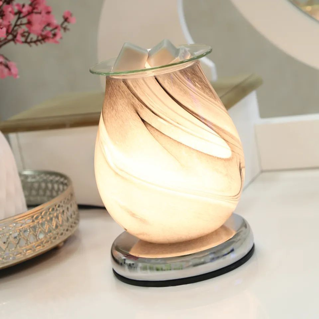 The Popular Grey Swirl Oval shape marble effect melter provides a modern feel while filling your home with your favourite fragrances. The Aroma Touch sensitive melter features Touch Technology, where touching the base of the melter gives you three different levels of heat and light.